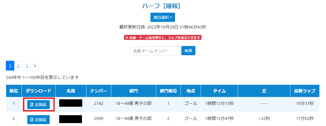 記録が閲覧できると同時にWEB記録証のダウンロードも可能です。
